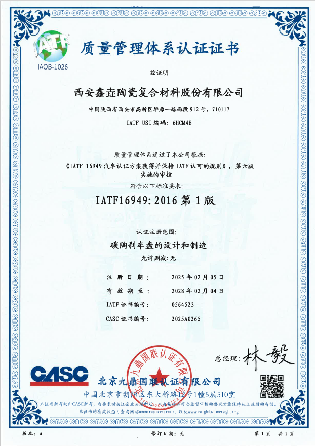近日,西安鑫垚陶瓷復(fù)合材料股份有限公司收到了北京九鼎國聯(lián)認(rèn)證有限公司下發(fā)的IATF 16949汽車質(zhì)量管理體系認(rèn)證證書,認(rèn)證注冊(cè)范圍為“碳陶...